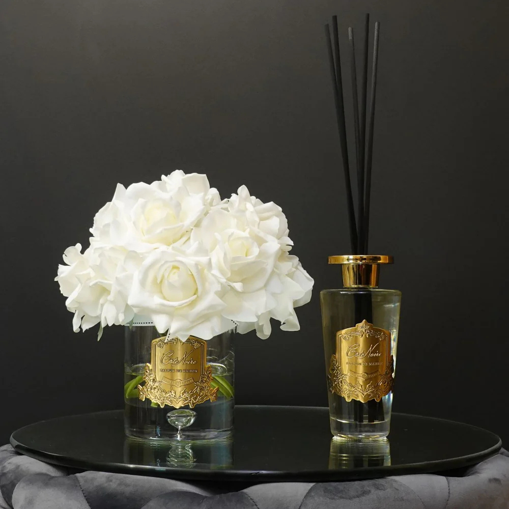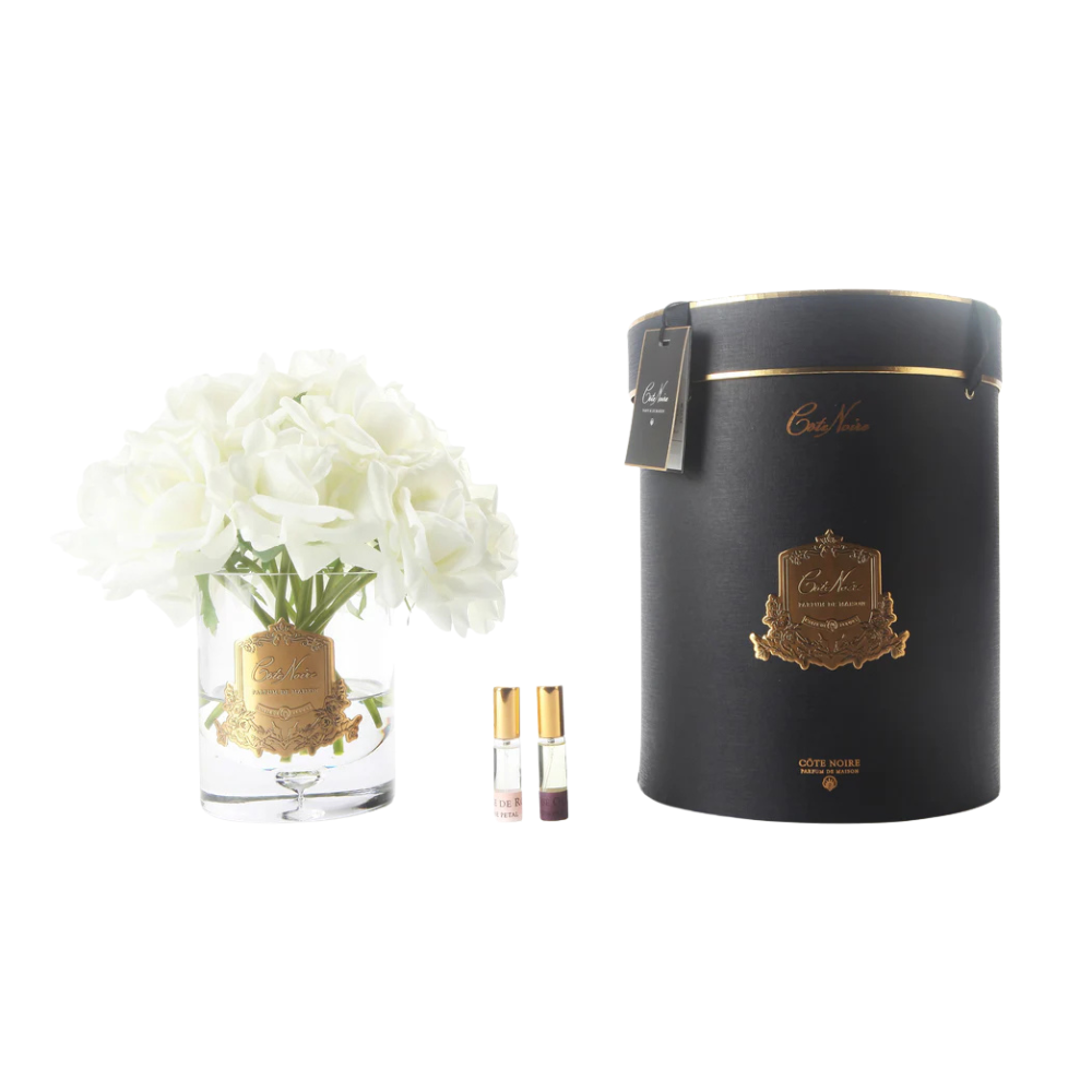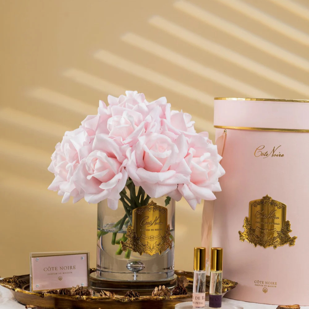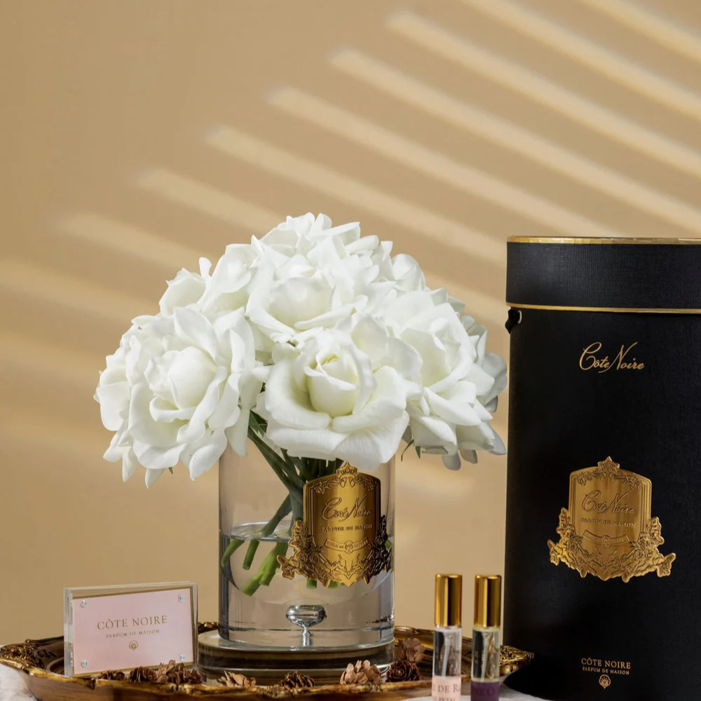 Each life-like perfumed Luxury Grand Bouquet has been skillfully hand crafted and is set in gel giving it the appearance of water. Each petal has a special natural coating to give them a true to life touch & appearance. Thirteen roses have been arranged in a luxury vase with a gold Cote Noire signature badge.