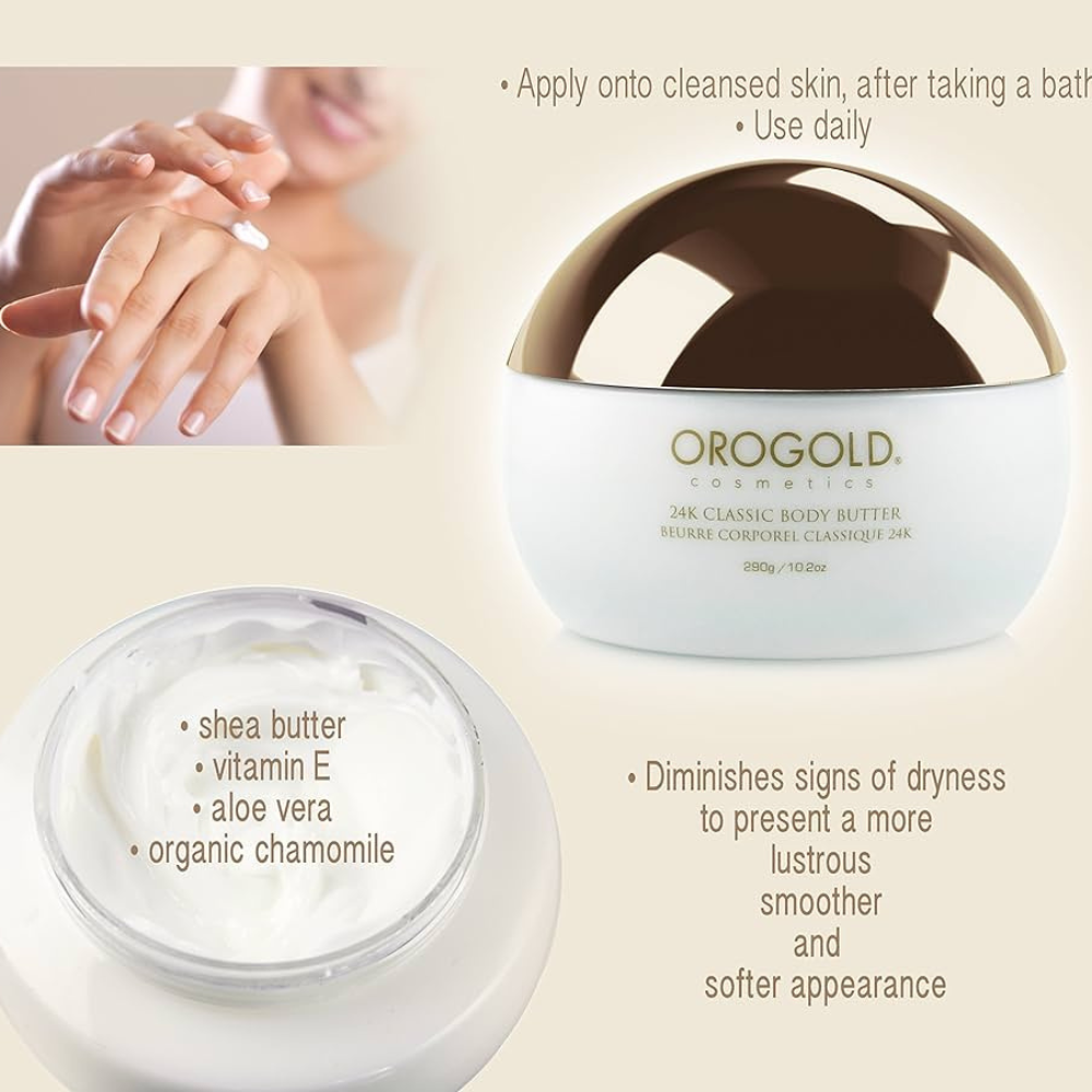 - 最適な結果と肌の柔らかさの向上のために、Orogold 24K クラシック ボディスクラブで角質を除去した後、ご使用ください。